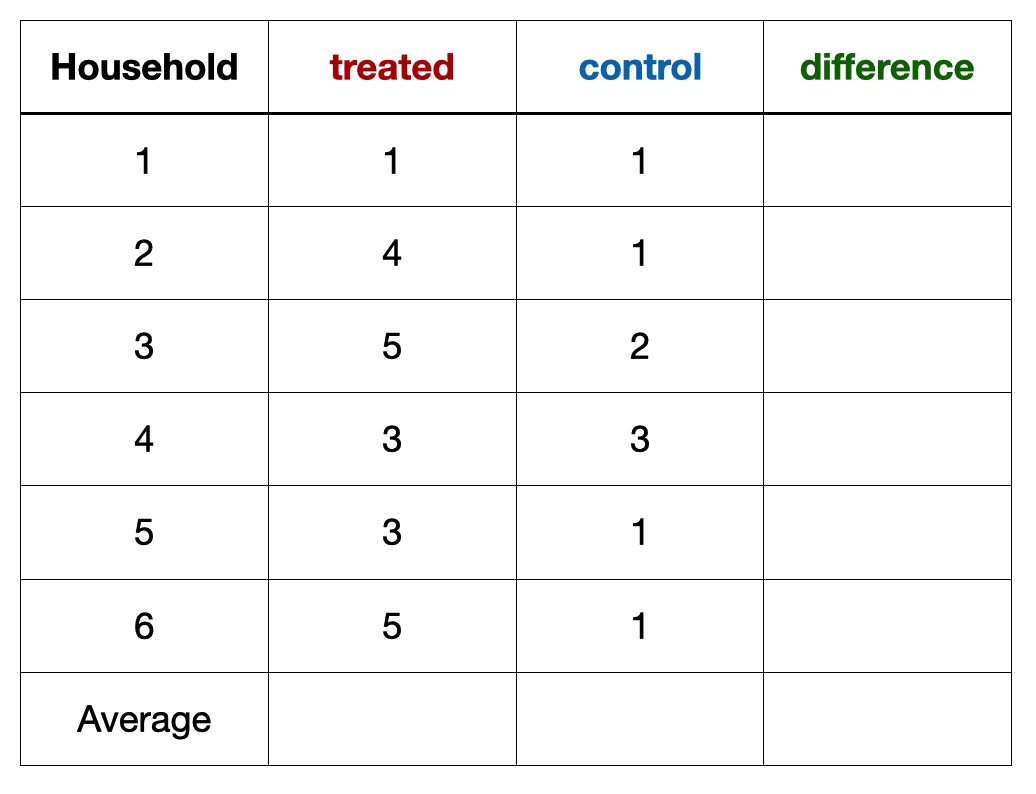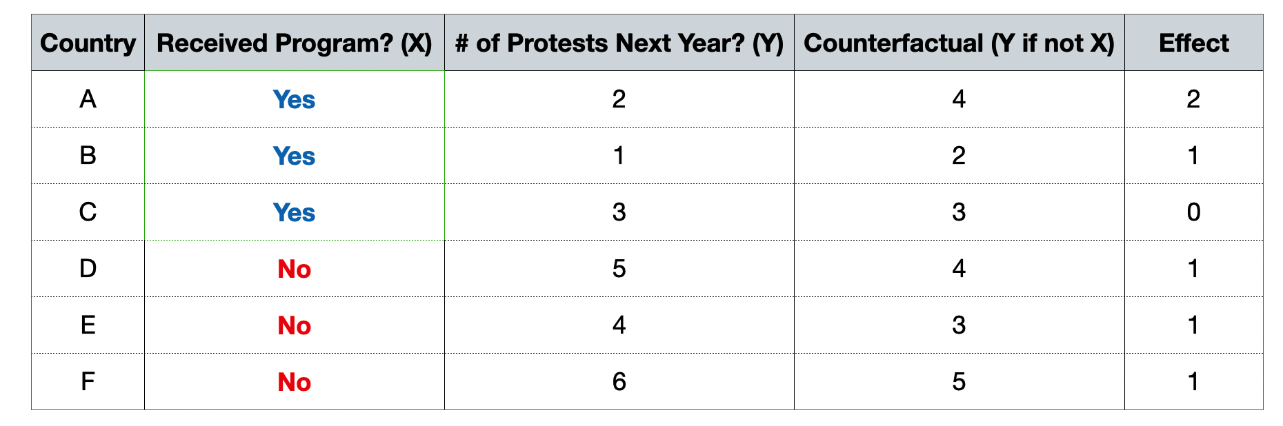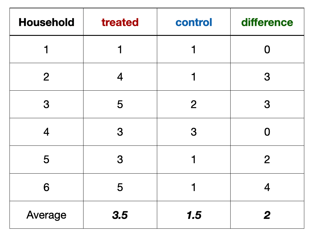 - Average effect for countries that received program: (2+1+0)/3 = 1