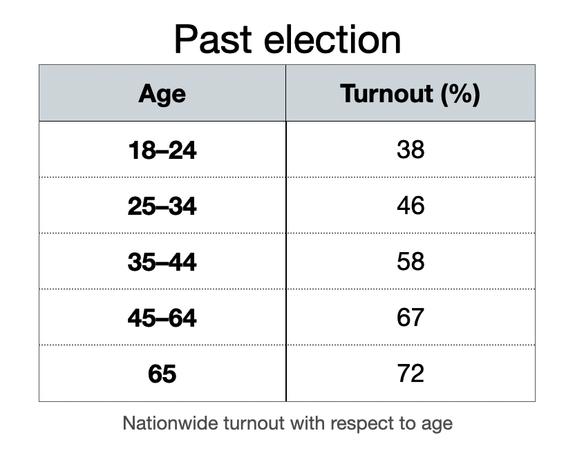 - Example: Next election, would we expect a high or low turnout at a university town?